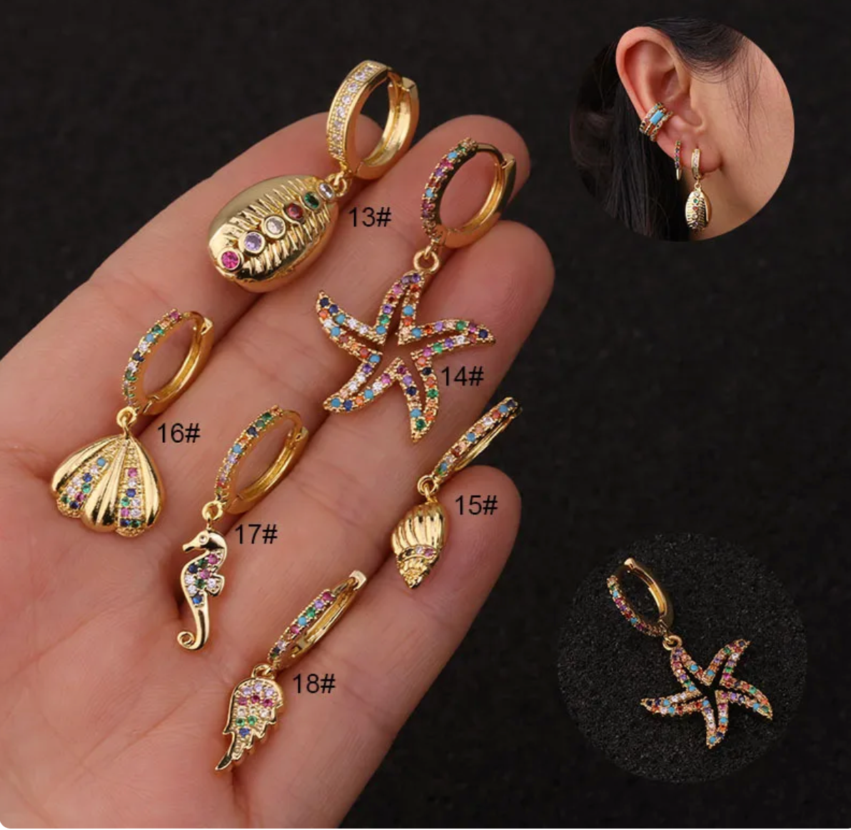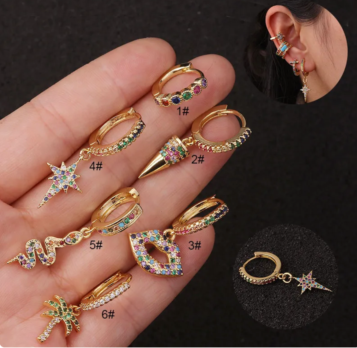 Huggies con circonias coloridos de diferentes formas. Diferentes figuras disponibles: Ala, Palmera, estilo Churumbela multiple y sencilla.