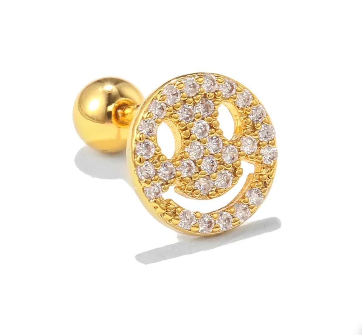 Piercing de acero inoxidable con baño de oro e incrustaciones de circonias. Ideal para nuevos piercings pues tiene tornillo atrás por lo que no es necesario quitarlo por la noche y no lastima. Perfecto para orejas sensibles. Se vende por pieza individual.