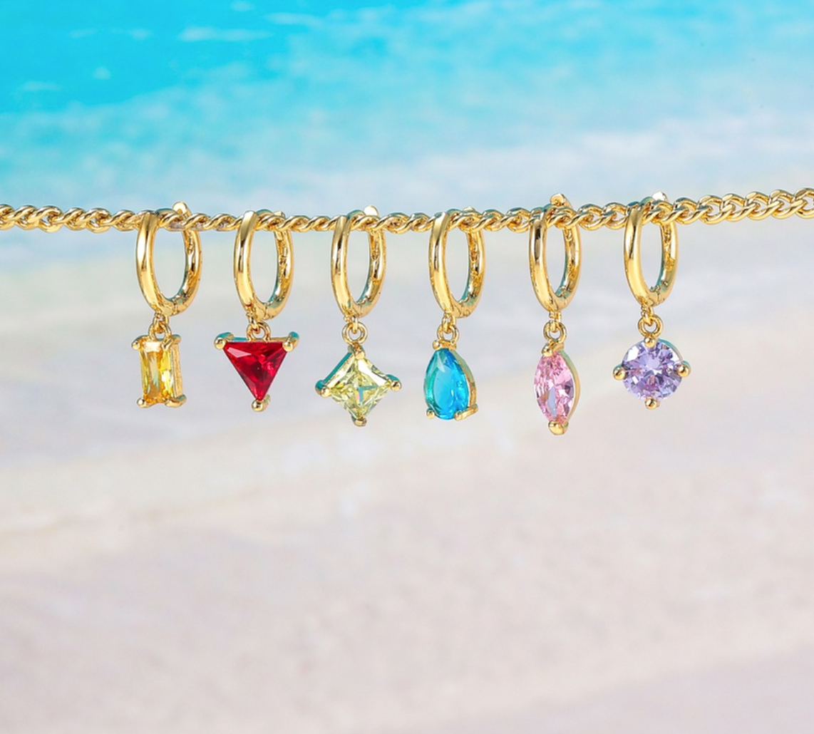 Mini hoops individuales con circonias de colores. Elige el color y forma que más te guste. Hechos de cobre con chapa de oro. Se vende por pieza individual.